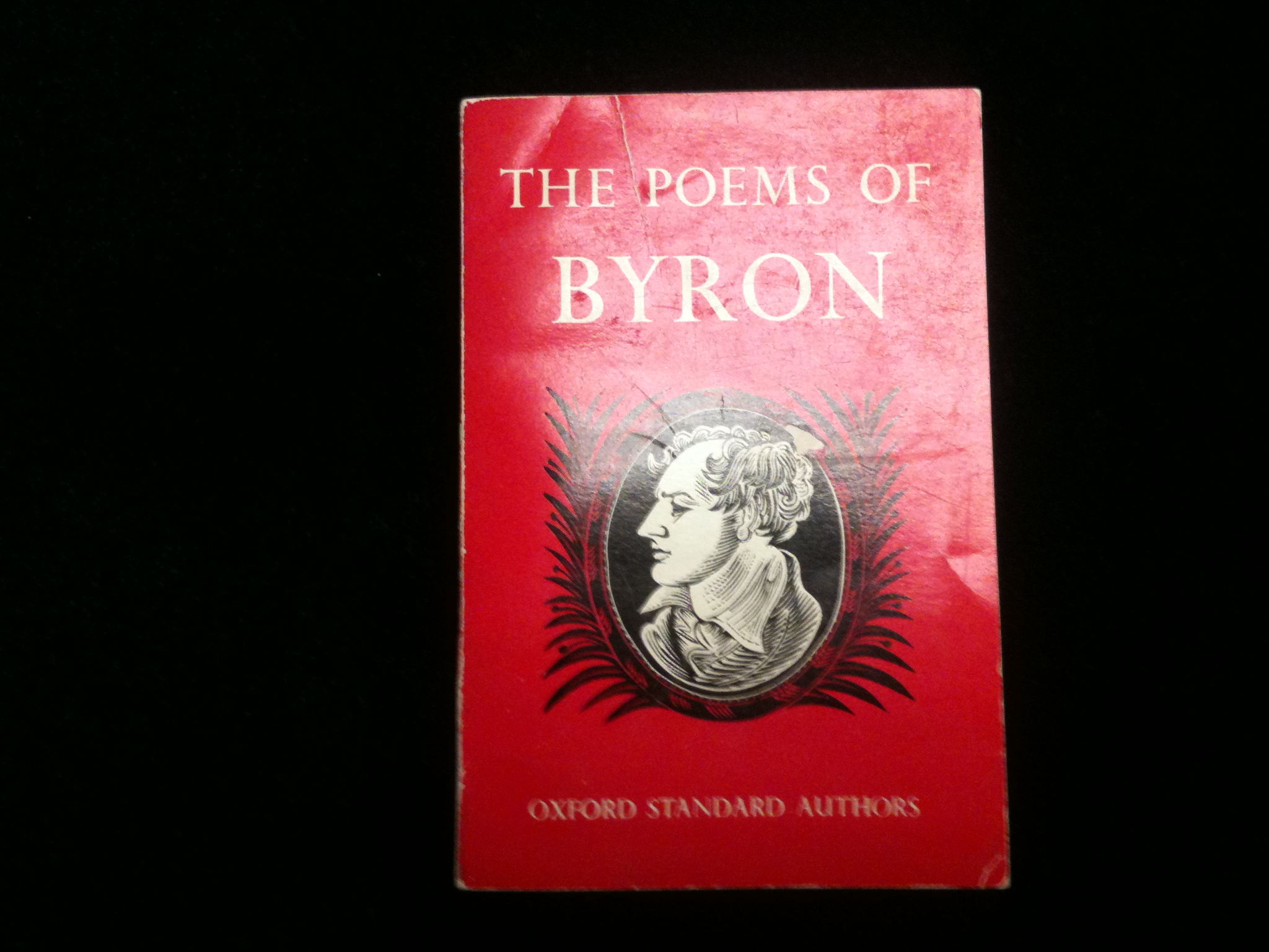 At Capitol Hill Books, I found this copy of Byron’s poems. It’s not absolutely, ideal (one day, I’ll show you my copy of Shelley, also bought at Capitol Hill Books – because that’s what a perfect used book of poetry look like!), but more than serviceable. It’s well read, but not disintegrating and though the cover is pinkish (I suspect that it was actually red when new, but has faded to something less masculine), it is generally what I would call a dignified book.