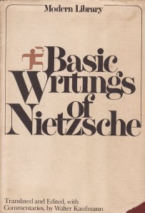 Methinks I really need to read this book. A couple of items I had read about before was Mencken’s role in promoting Nietzsche on this continent and the other was the accusation that Walter Kaufmann ‘sanitized’ Nietzsche. Because, yes, I came to Nietzsche through Kaufmann and his ubiquitous translations (particularly the one pictured).