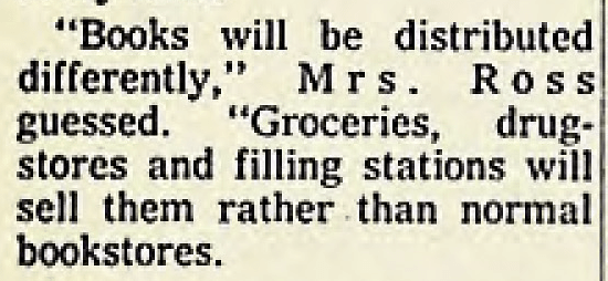 But it was Mrs. Ross’ comment about books being sold in groceries, drugstores, and filling stations.