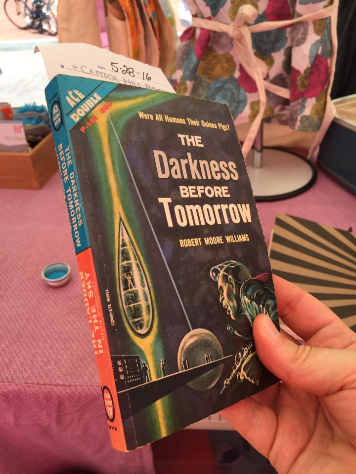 That day I’d brought two books with me to read while I was working for my better half at Eastern Market. Unfortunately, I’d misjudged the speed of my reading and found myself bookless by noon, so I ran to Capitol Hill Books during a lull and grabbed this Ace Double – mostly because it was an Ace Double and I just think the idea is cool – for four dollars twenty-four cents, including tax.