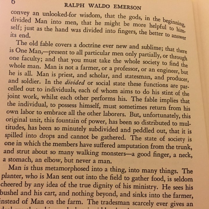 The paragraph is from Ralph Waldo Emerson’s essay, The American Scholar. While reading it before bed the other night, I wondered whether or not it was just or whether he really seemed to be describing the Marxian concept of people’s alienation from the fruit of their labors? Of course, his solution is more spiritual, combined with what might now be described as college town, farmer’s market, DIY liberalism (and Marx never really wrote out the solutions, did he? No, not really).