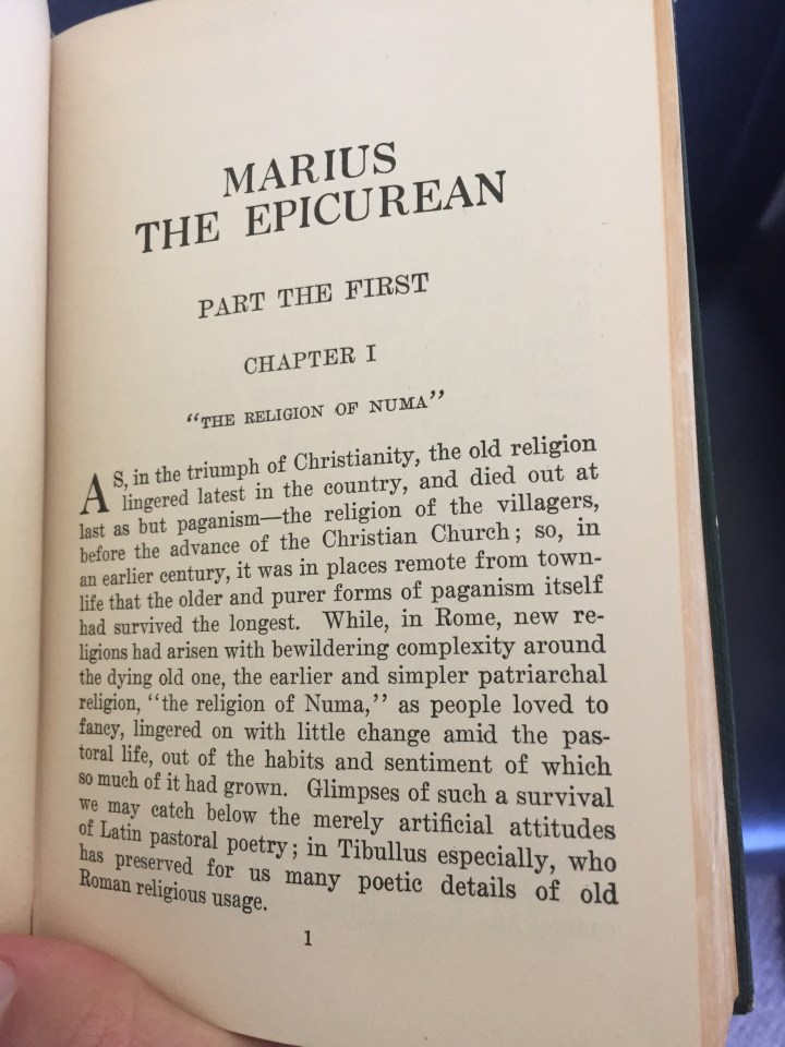 It’s not a novel that illustrates or explicates a certain philosophy. You won’t learn much about Epicureanism (and really, Marius is never actually, so far as I can tell, a followed of Epicurus). But you will, if you’re willing, be able to drift back into a Rome of late antiquity (the Stoic philosopher-king Marcos Aurelius is emperor), but really, you’re in a European, upper class milieu of intellectuals.