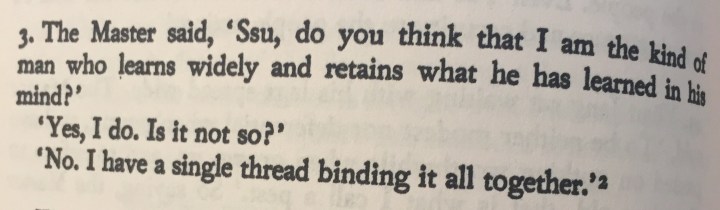 I had started to jot down some pithy phrase from The Analects: not the one in the picture, but something about a scholar or reader not being inflexible. It felt like a retort to Trump World.
