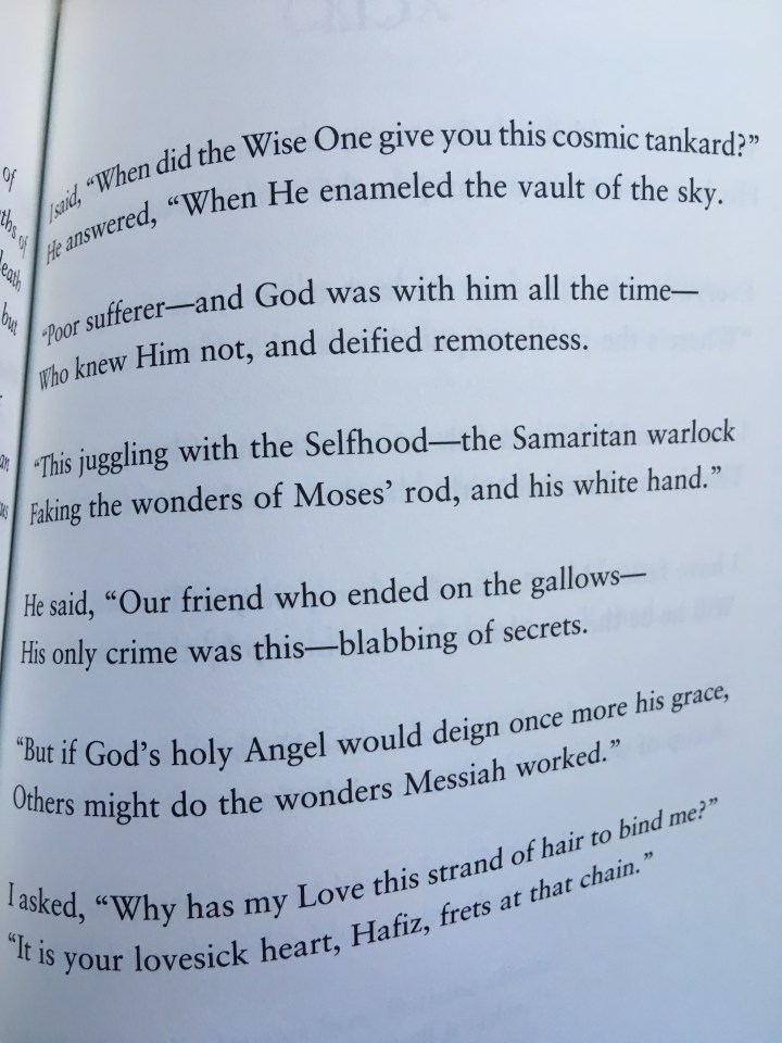 I have, honestly, never read nor wanted to read much of the trifecta of popular, mystical, Islamic poets known to western, non-Muslims (Hafiz and his even more popular compatriots, Gibran and Rumi), but I was glad I made an exception for Hafiz. And I have read enough into Sufism to understand that the erotic, alcoholic message is, truly a spiritual metaphor (and is it any more erotic than the religious poetry of Teresa de Avila?).