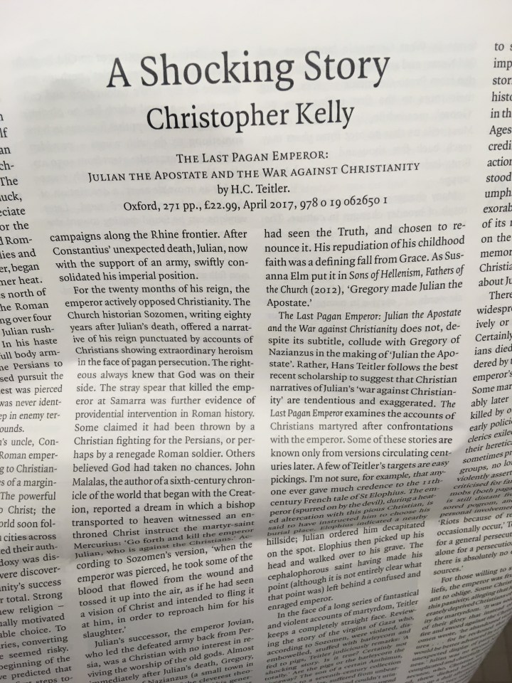 Of course, this article from LRB drew me because of Gore Vidal’s novel, Julian. And this review, while never mentioning the novel (an odd oversight, I thought, even if you are not a Gore fan), suggests that the novel’s history is t bad.