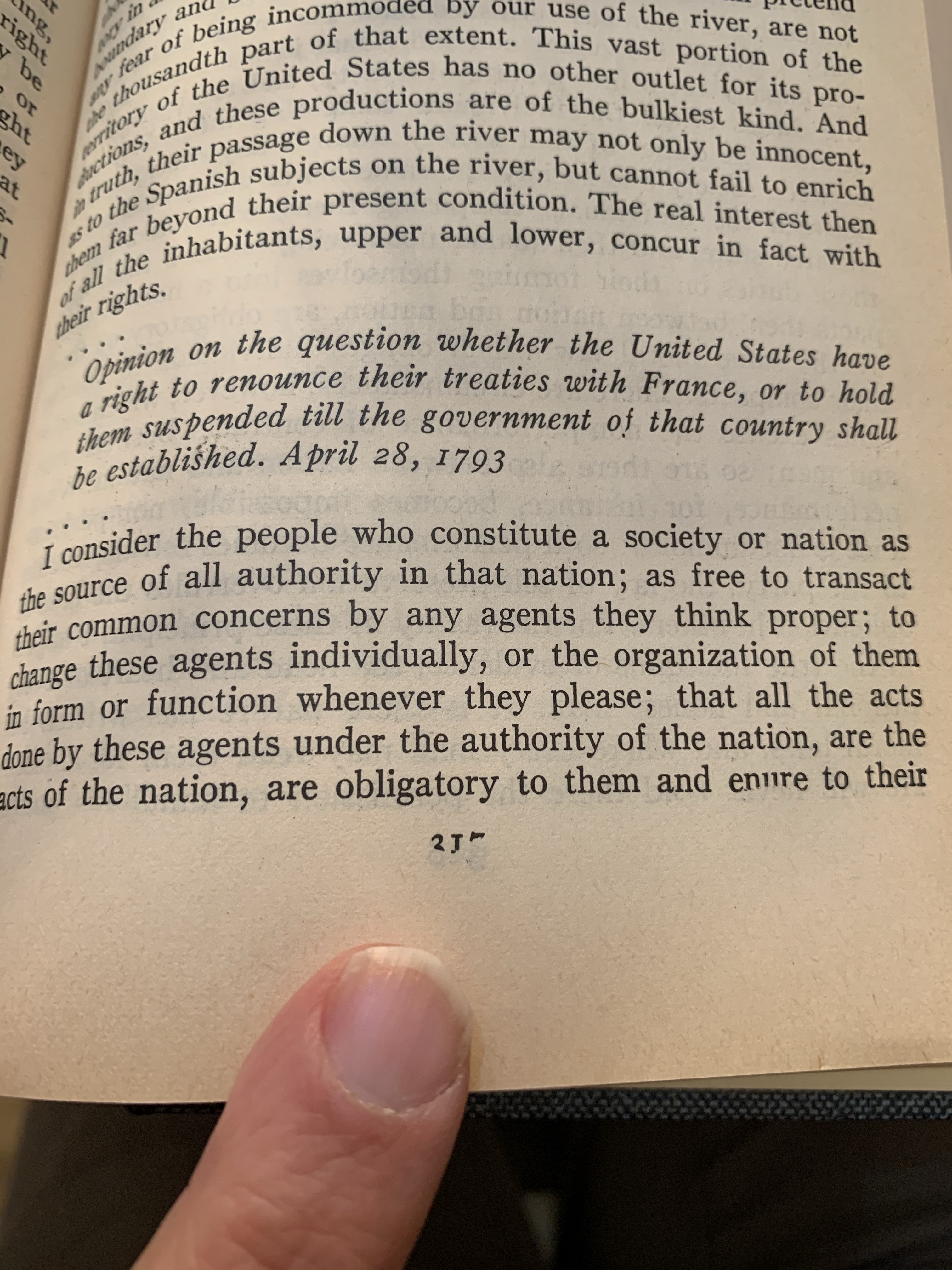 In an otherwise only marginally interesting answer to the question of whether the United States should renounce its treaties with France until it had established a government. While it’s not clear who needs to establish a government, because both countries had some ups and downs, the date of 1793 suggests it was France that needed to sort itself out.